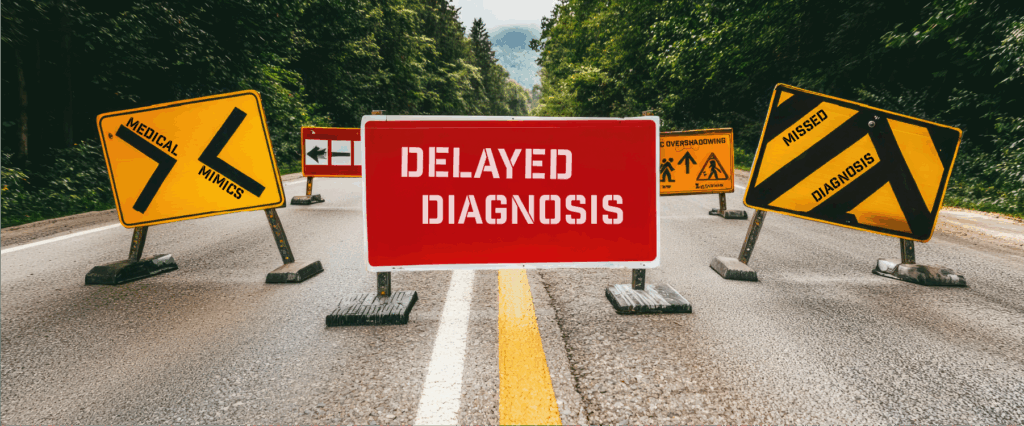 - Delayed Diagnosis: A diagnosis is made later than it should be. One example of this is that many people with autism and attention deficit hyperactivity disorder (ADHD) initially receive an ADHD diagnosis, but not an autism diagnosis, leading to delays in receiving support for autism and confusion about oneself and one’s response to treatment.